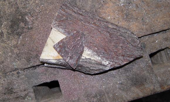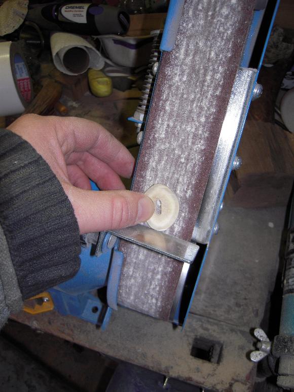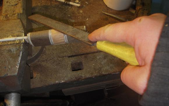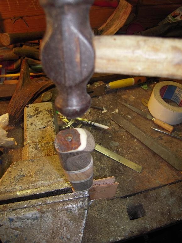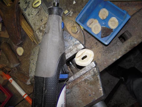 Danach sägen wir aus einem alten Stück Geweih eine Nietplatte für den hinteren Abschluß ab: