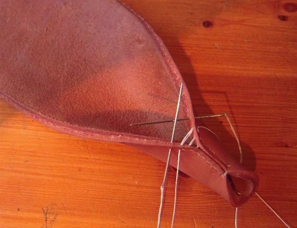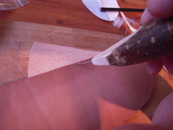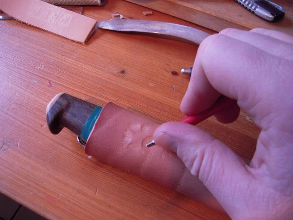 Wenn man dann mit dem Polieren des Griffes fertig ist und zum Schluß noch die 400er und die 800er Körnung Papier genommen hat, dann geht es an die Lederarbeit. 150 Löcher stechen. mit zwei Nadeln durch jeweils 150 Löcher gehen (300 Stiche) und dann dem trocknenden Leder noch eine individuelle Verzierung pauten.